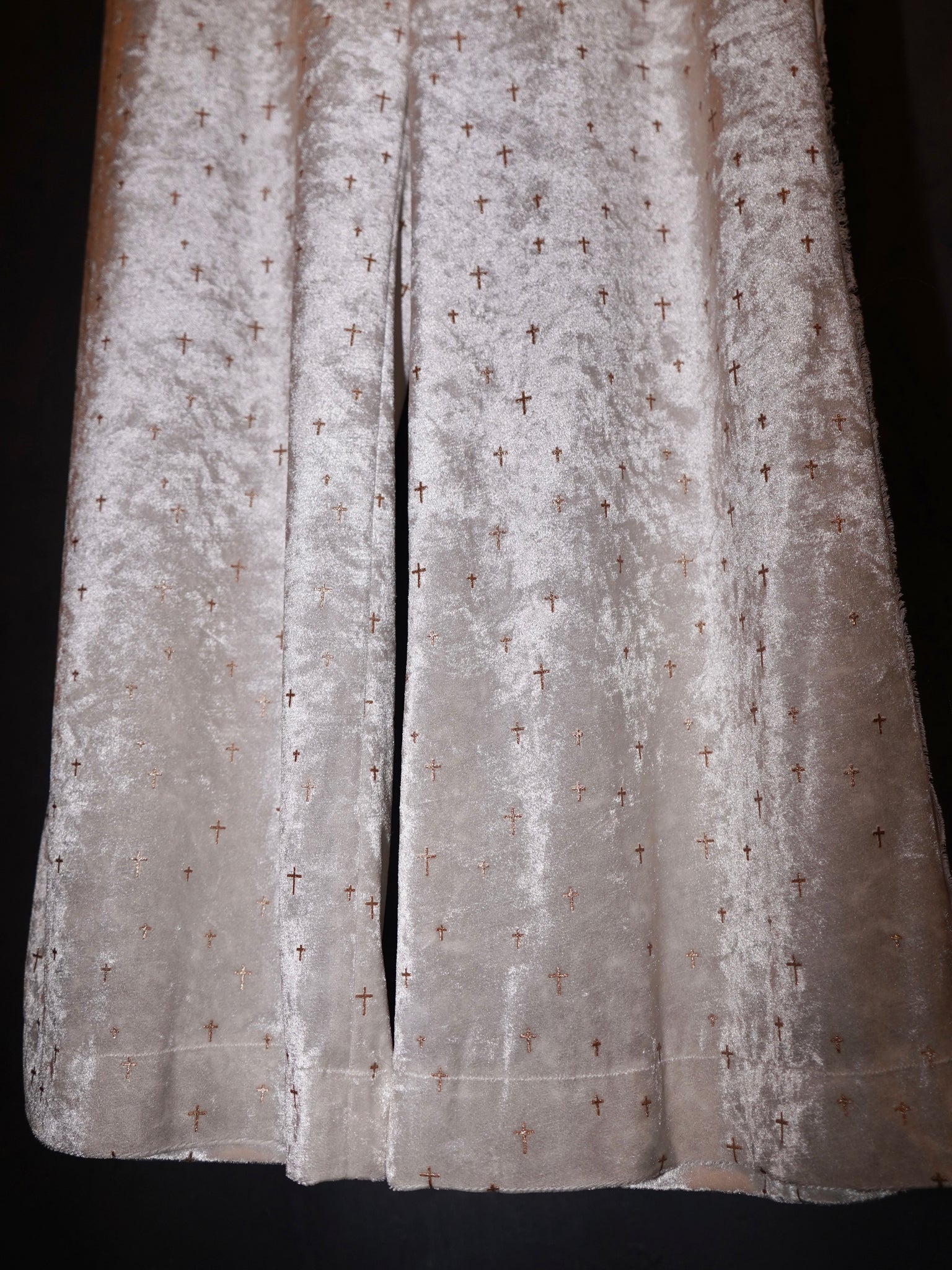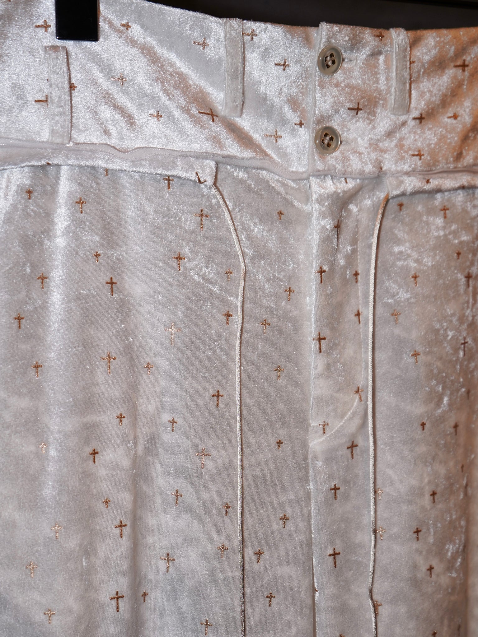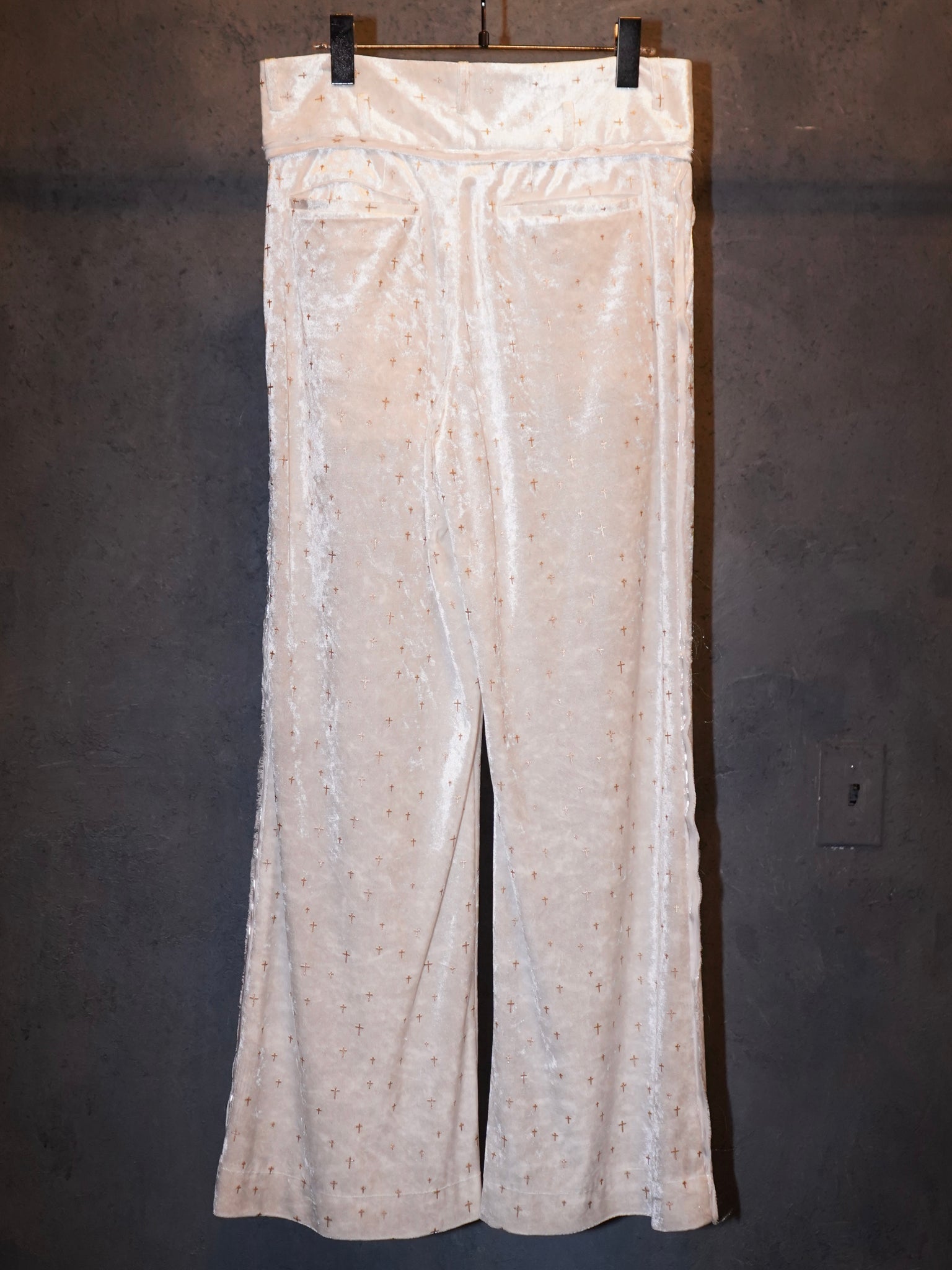 Detail:独自開発された刺繍のような立体的なグリッタープリントを施したベロア生地を使用し、クロスモチーフだがラグジュアリー感の溢れるイージーワイドパンツ。