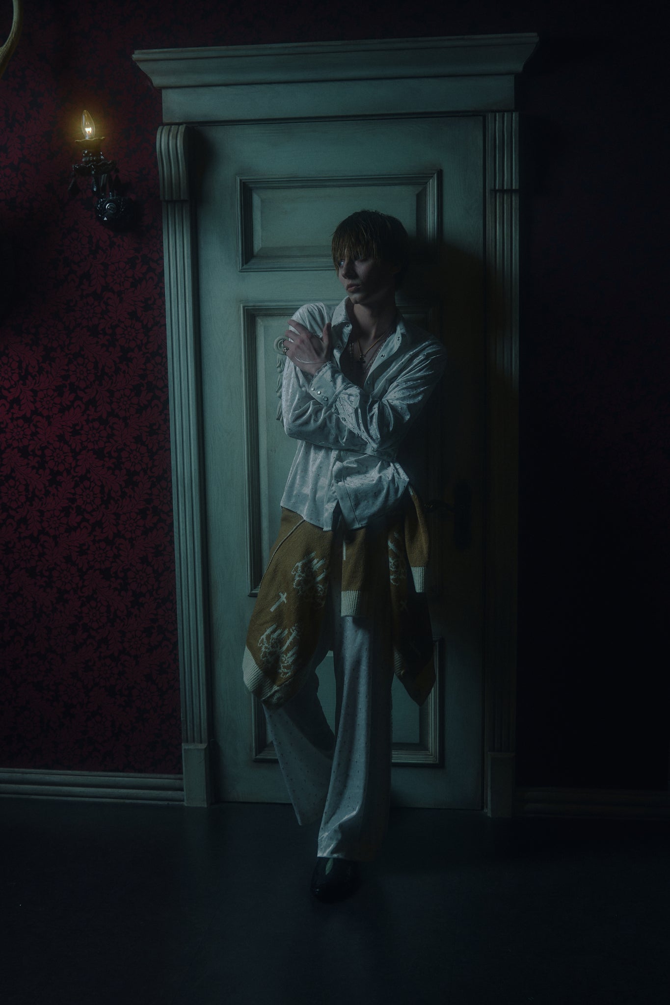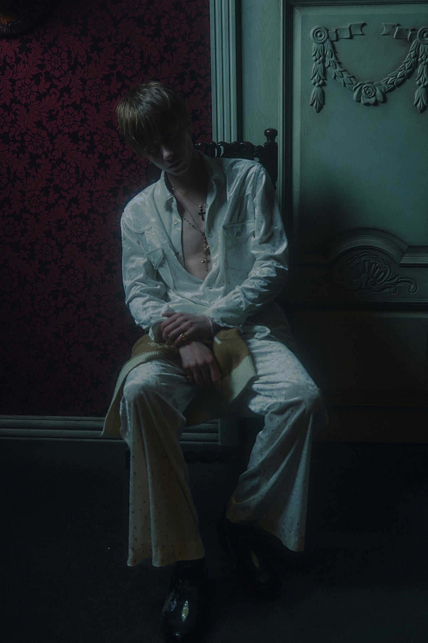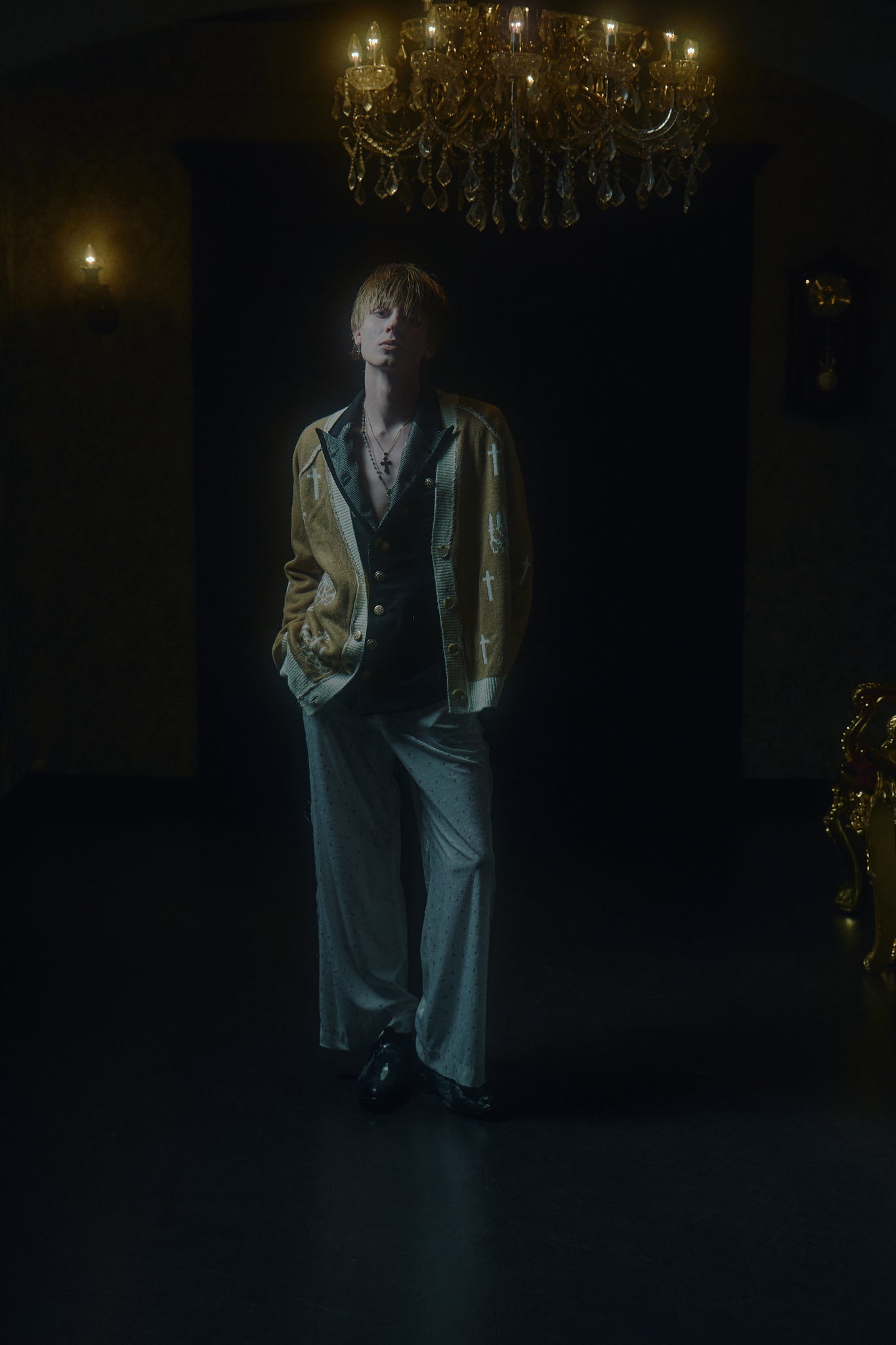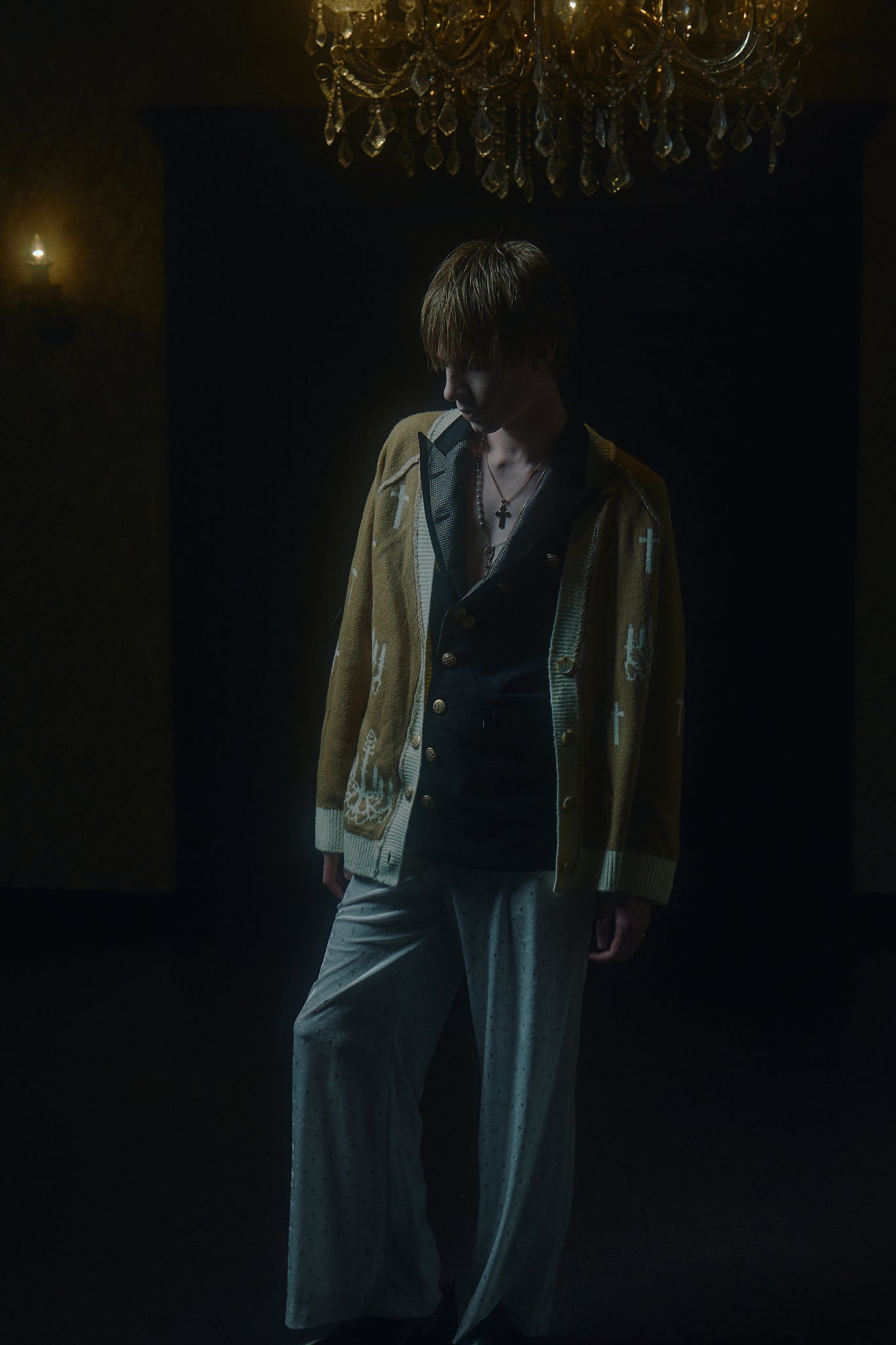 Detail:独自開発された刺繍のような立体的なグリッタープリントを施したベロア生地を使用し、クロスモチーフだがラグジュアリー感の溢れるイージーワイドパンツ。