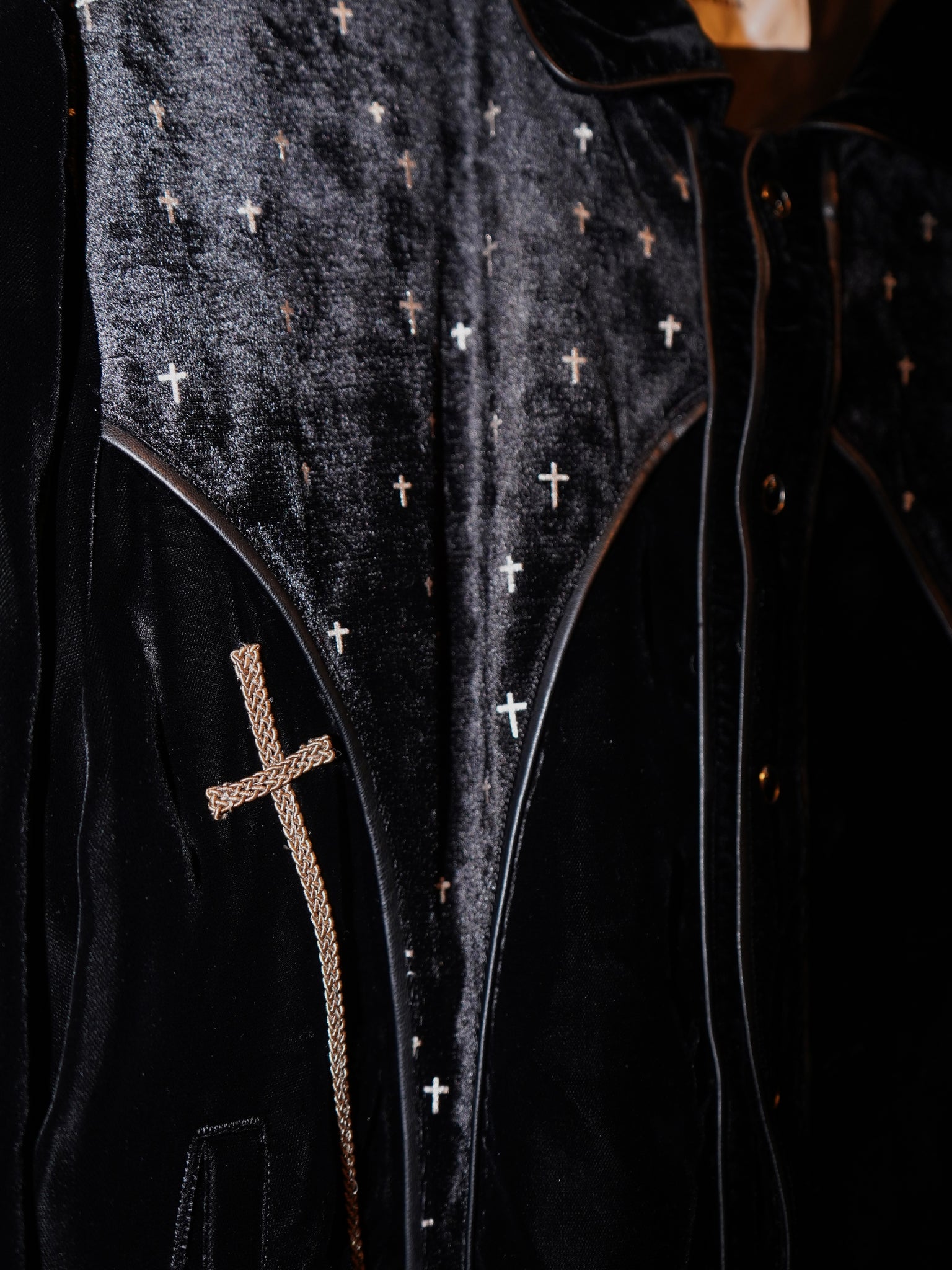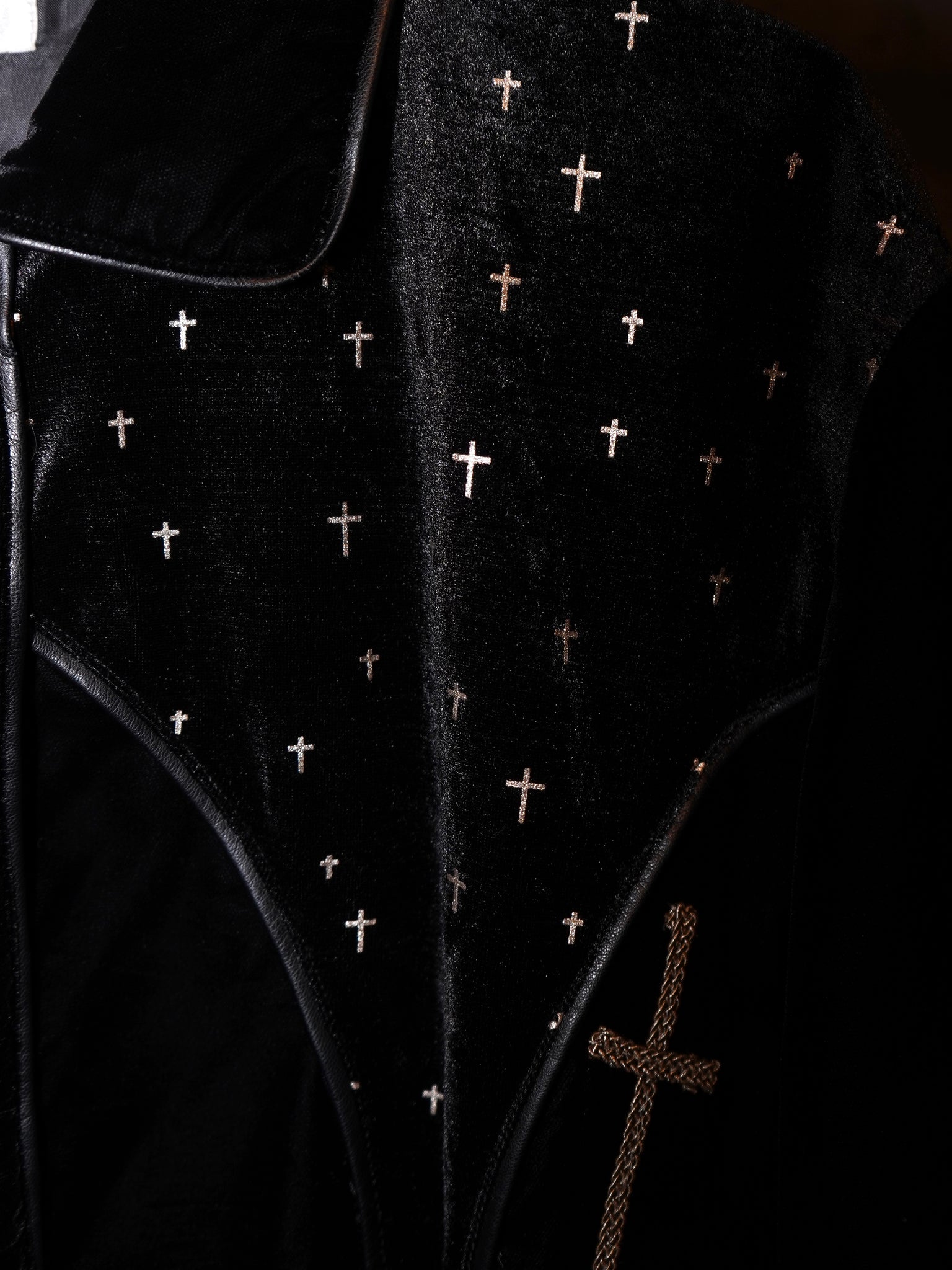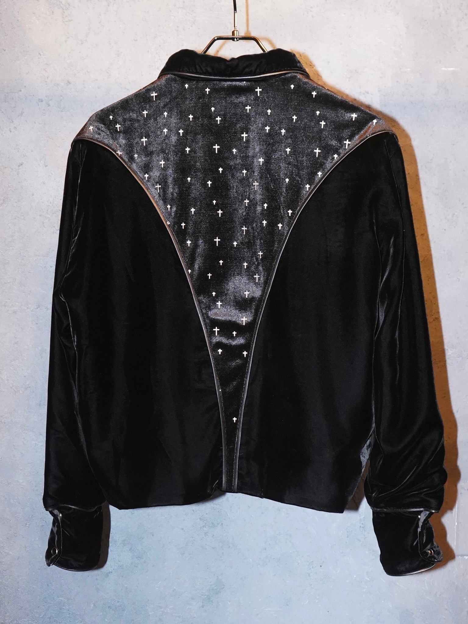 Detail:ショート丈のウエスタンジャケット。独自開発された刺繍のように見える立体感あるグリッタープリントでオリジナルの生地を製作し、メイン生地のベルベットと切り替え十字架モチーフだが、ラグジュアリー感溢れるアイテム。