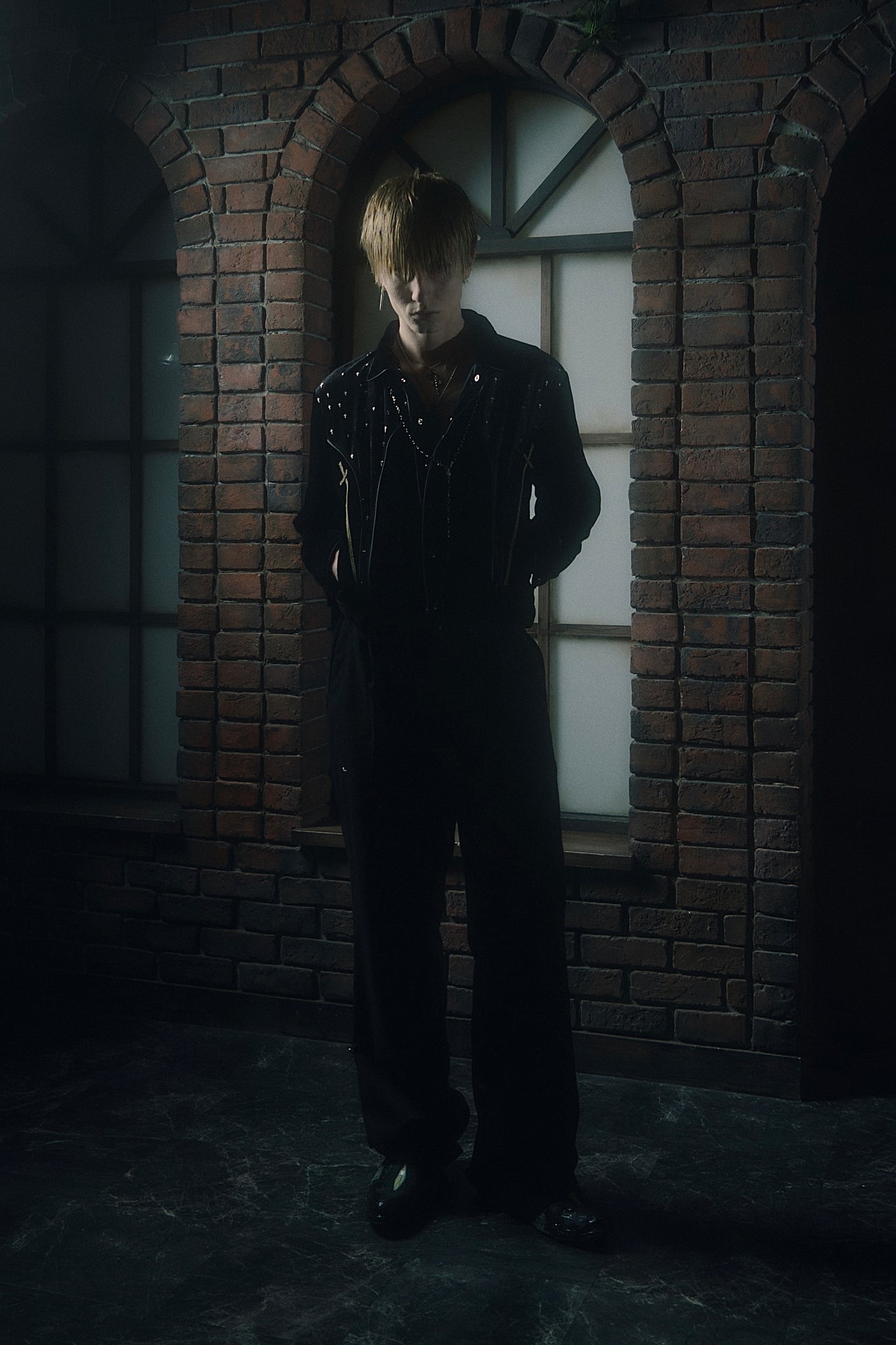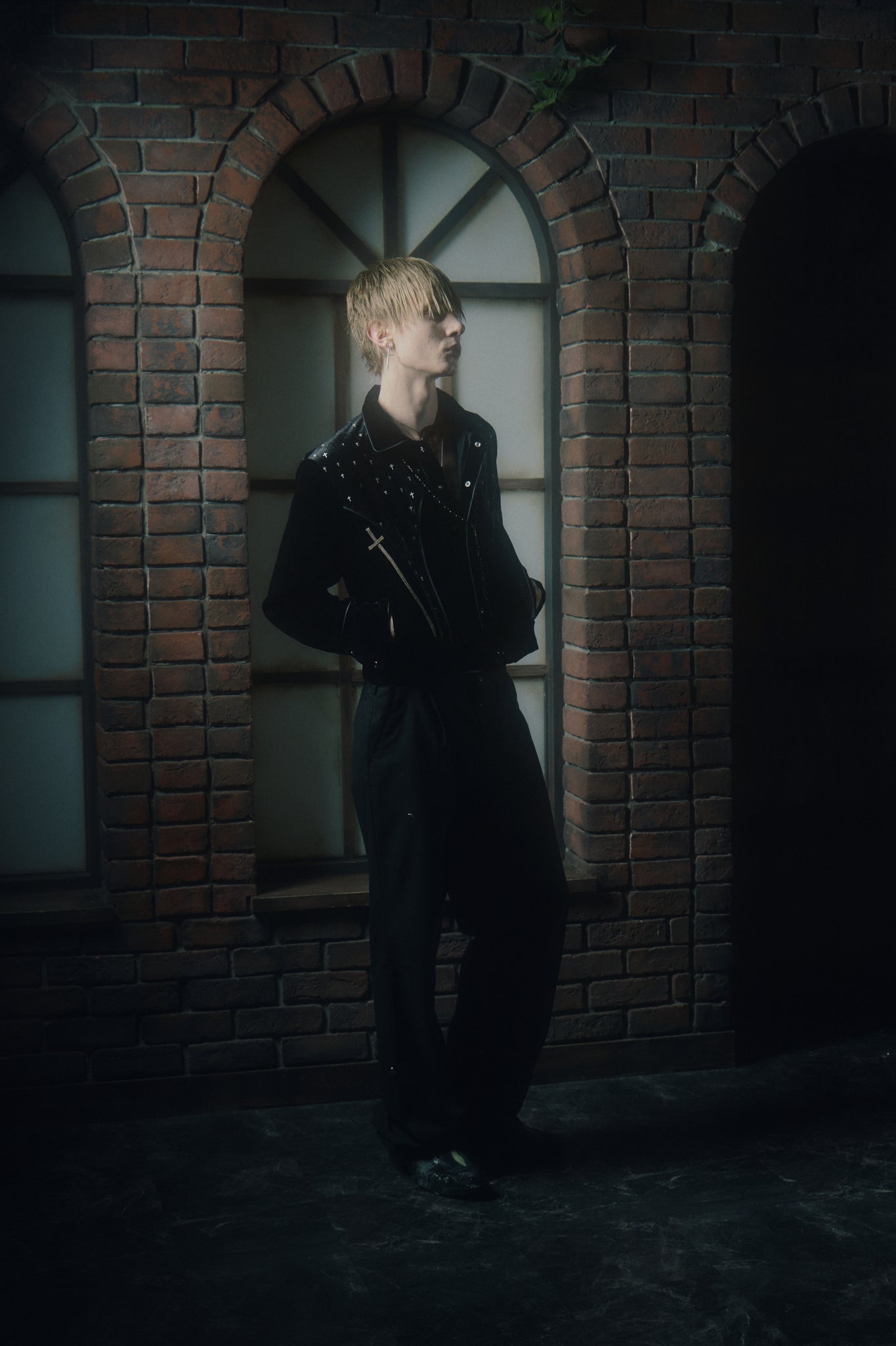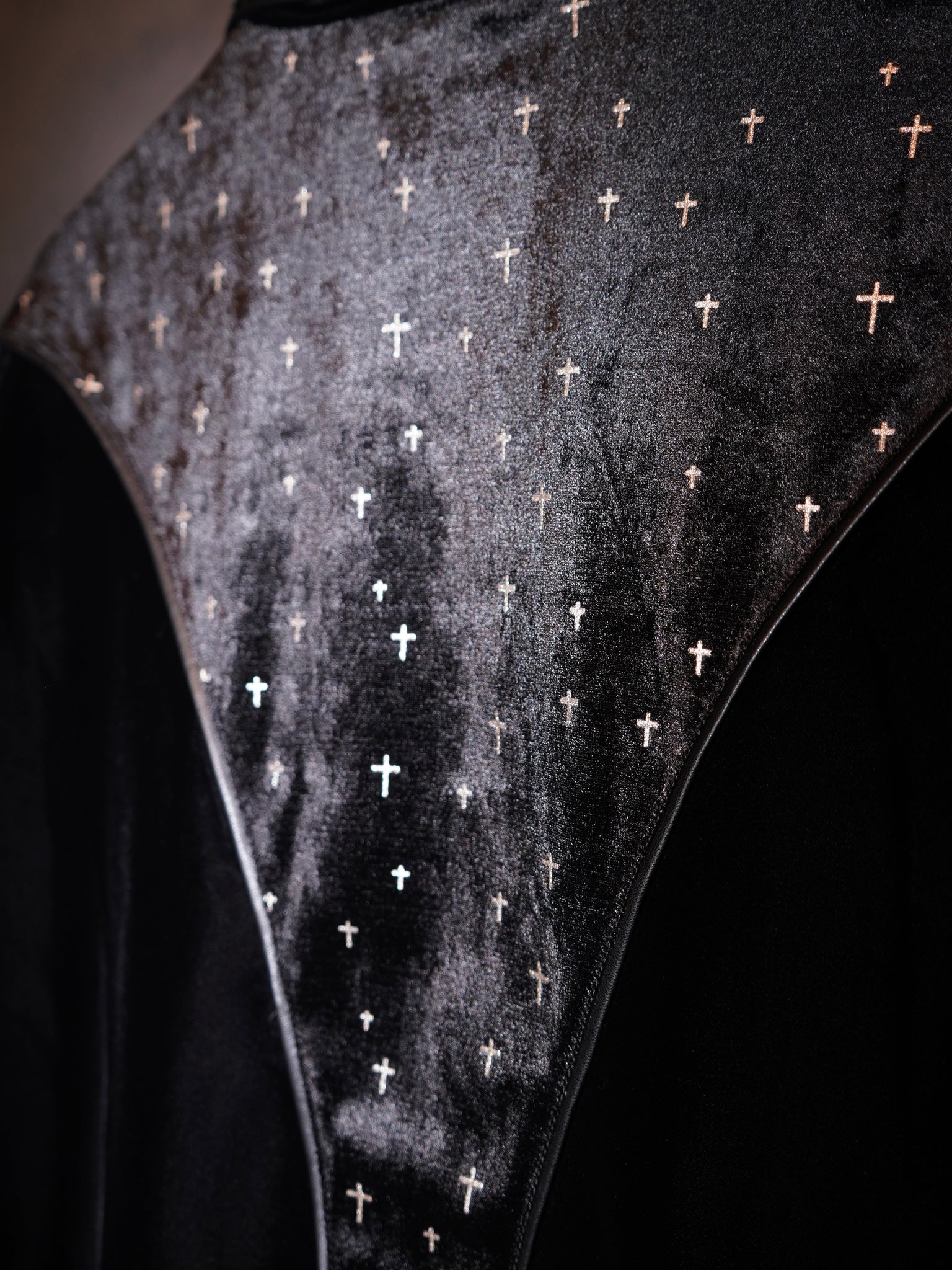 Detail:ショート丈のウエスタンジャケット。独自開発された刺繍のように見える立体感あるグリッタープリントでオリジナルの生地を製作し、メイン生地のベルベットと切り替え十字架モチーフだが、ラグジュアリー感溢れるアイテム。