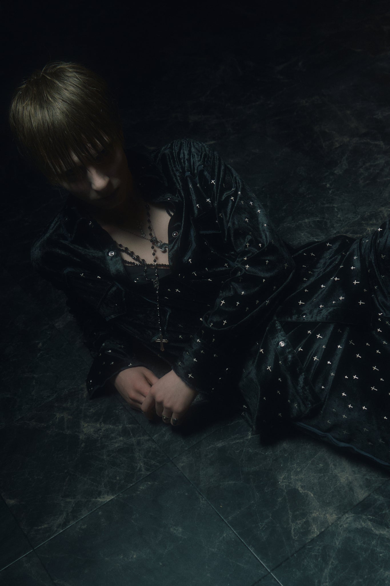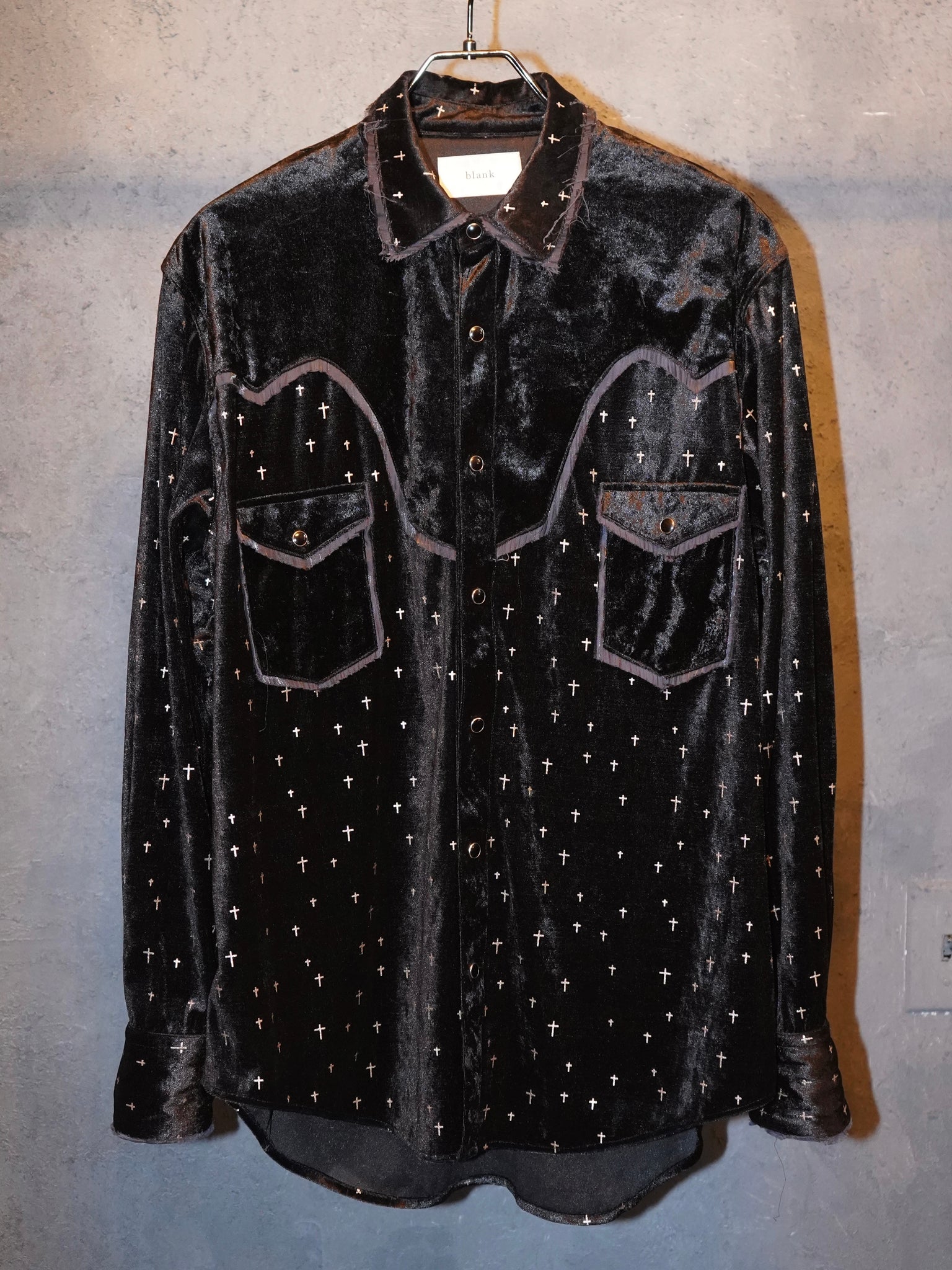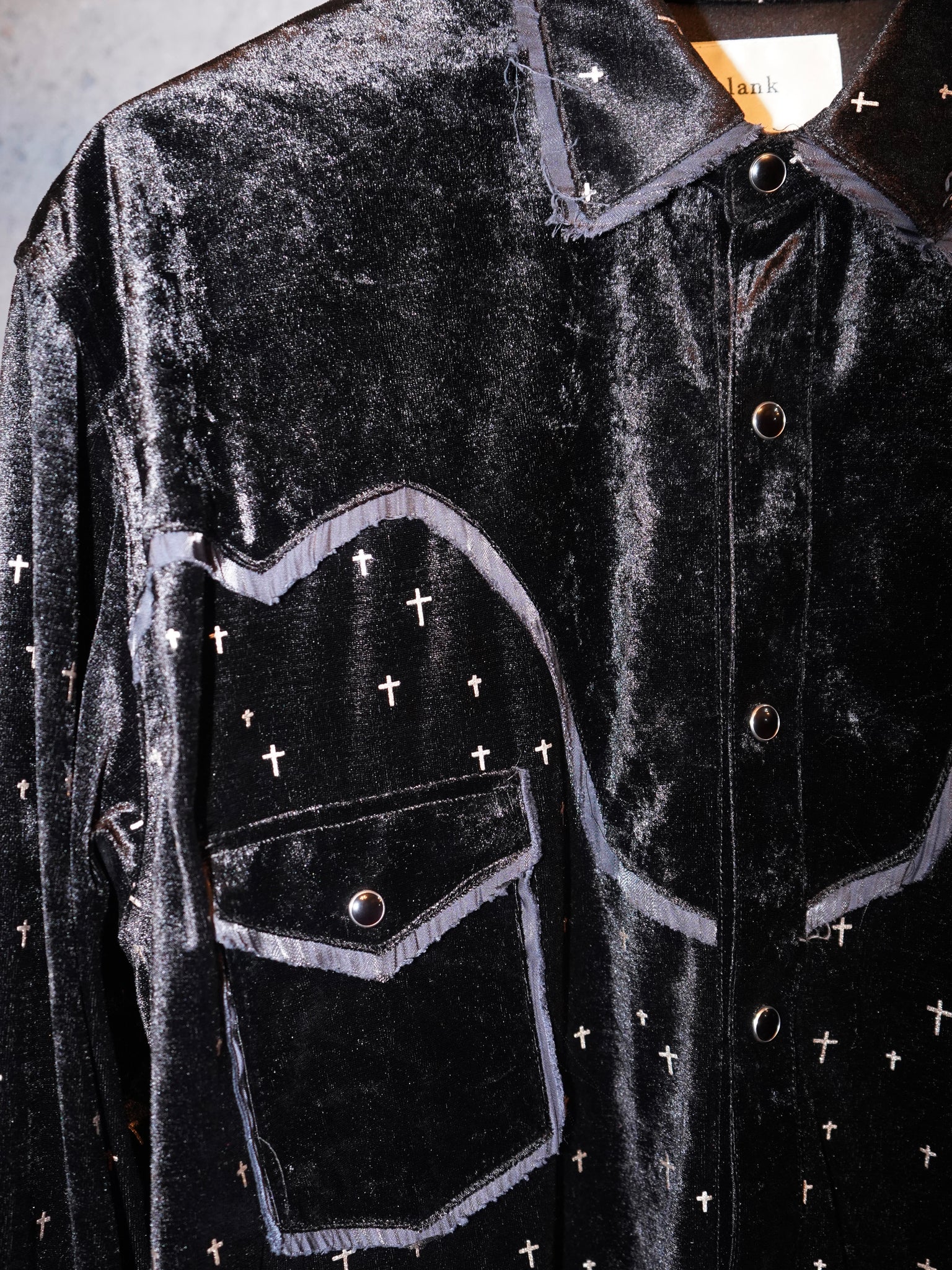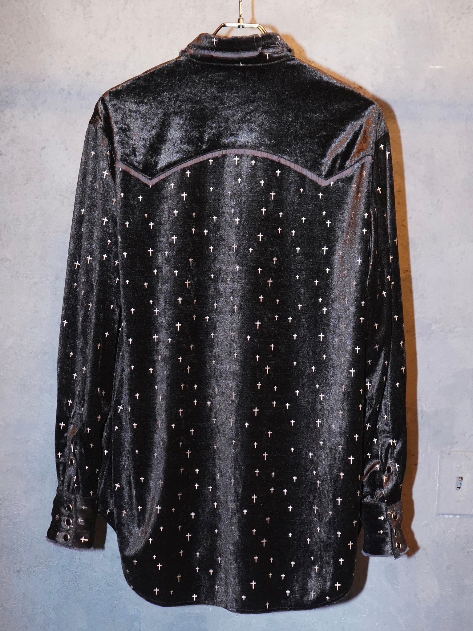 Detail:独自開発された刺繍のような立体的なグリッタープリントを施したベロア生地を使用し、クロスモチーフだがラグジュアリー感の溢れるウエスタンシャツ。