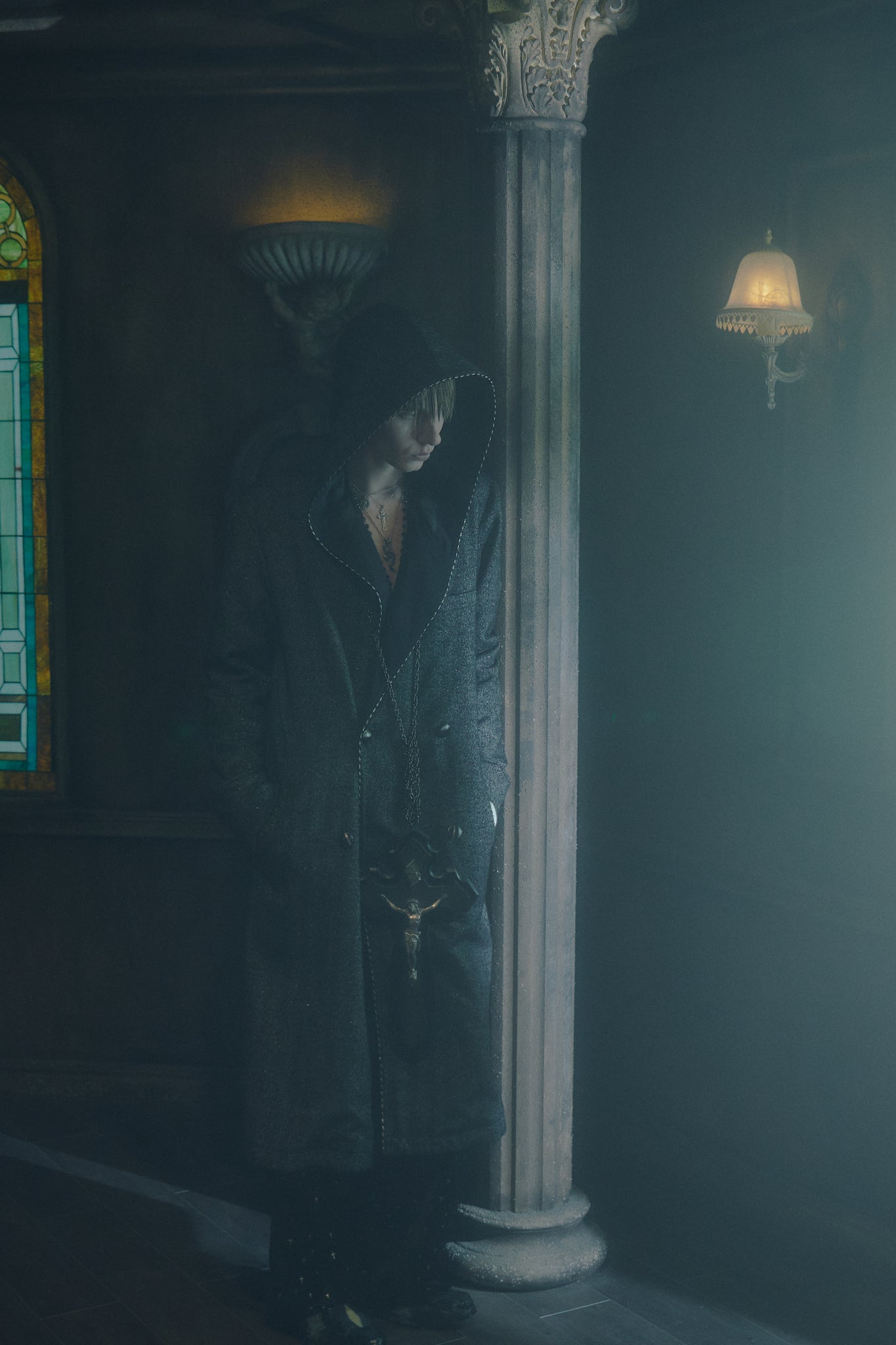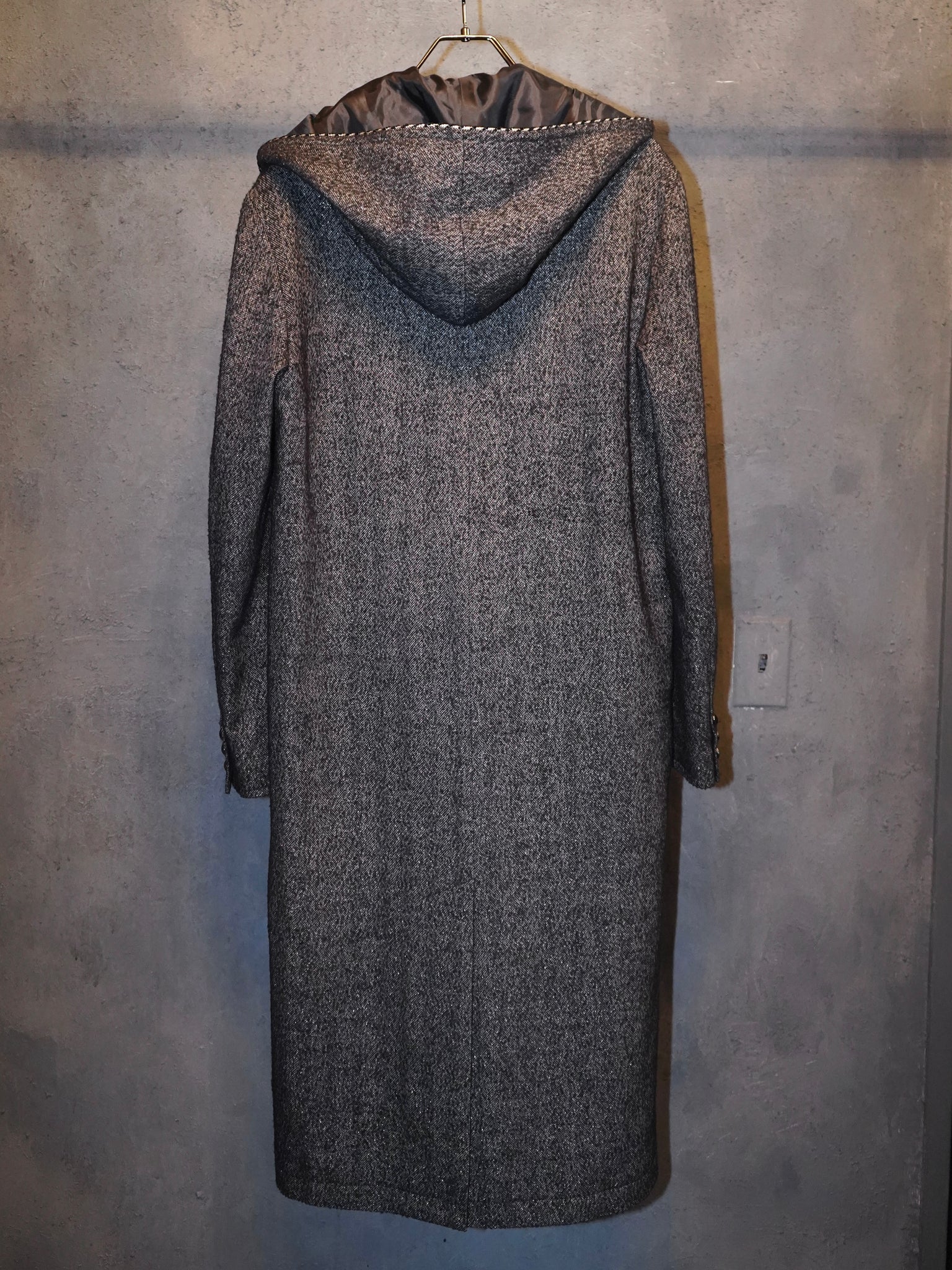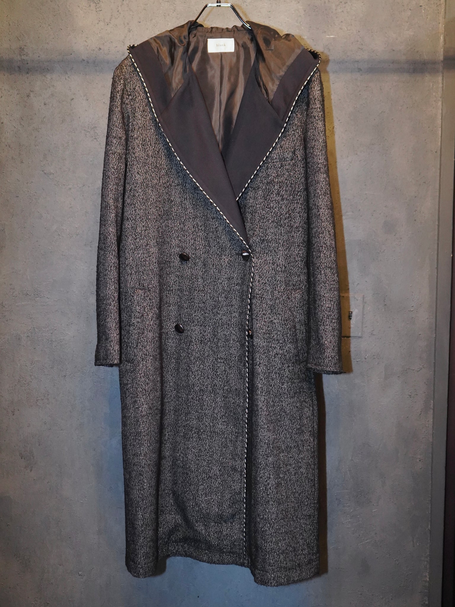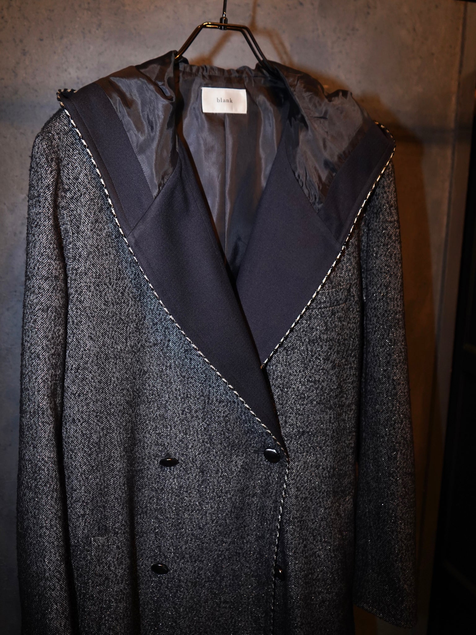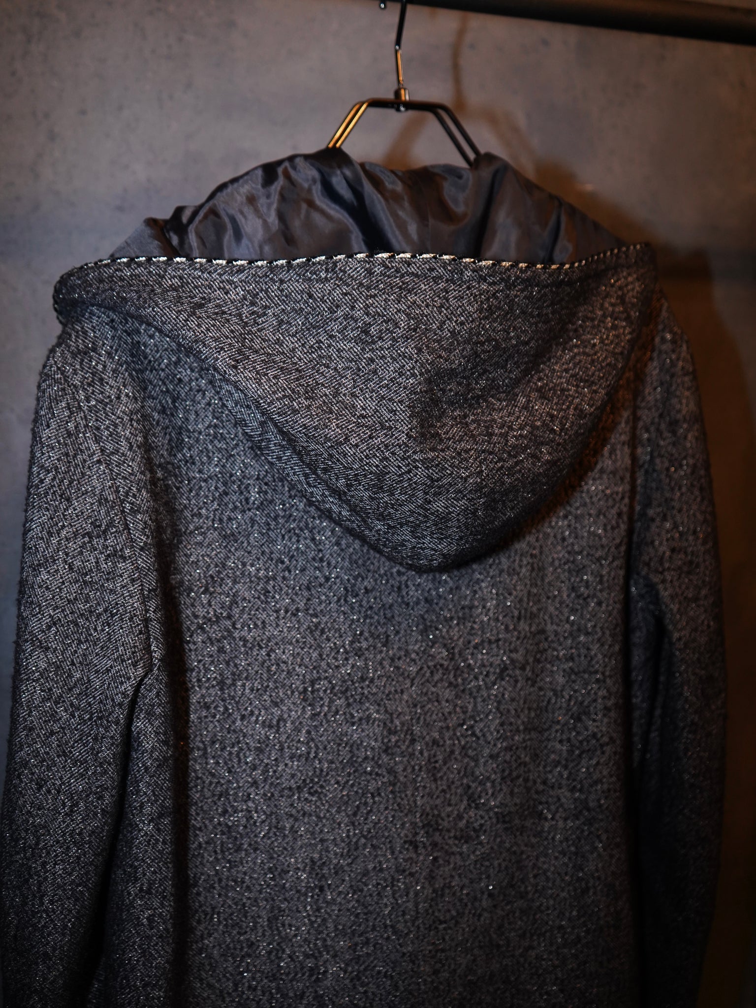 Detail:大きめのフード仕様のWコート。ラメツイードの生地とパイピングが良いアクセントに。