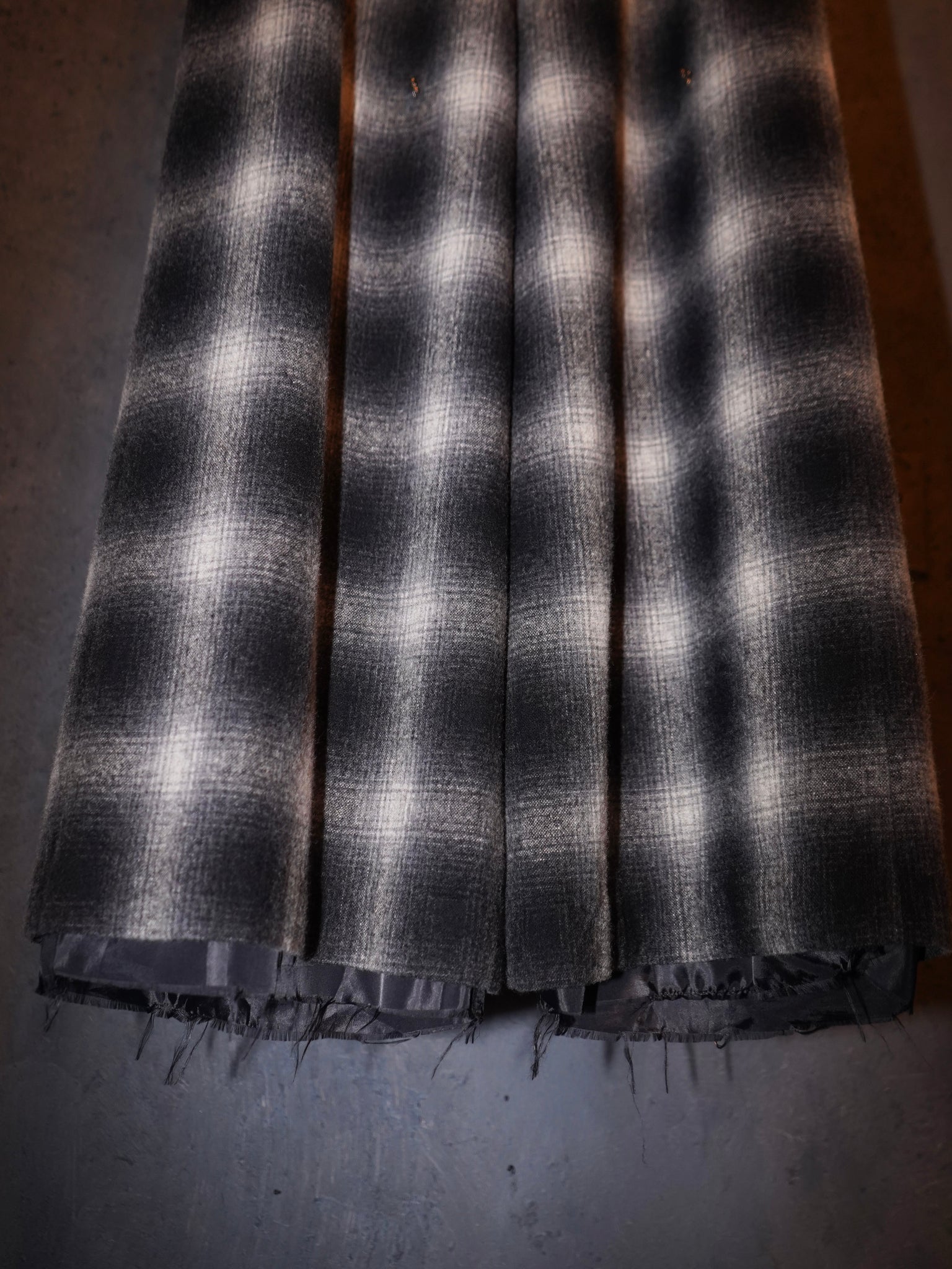 ワイドで裾にかけて広がっていく綺麗なシルエット。裏地をカットオフ仕様にしており、綺麗すぎず、退廃的に仕上げている。