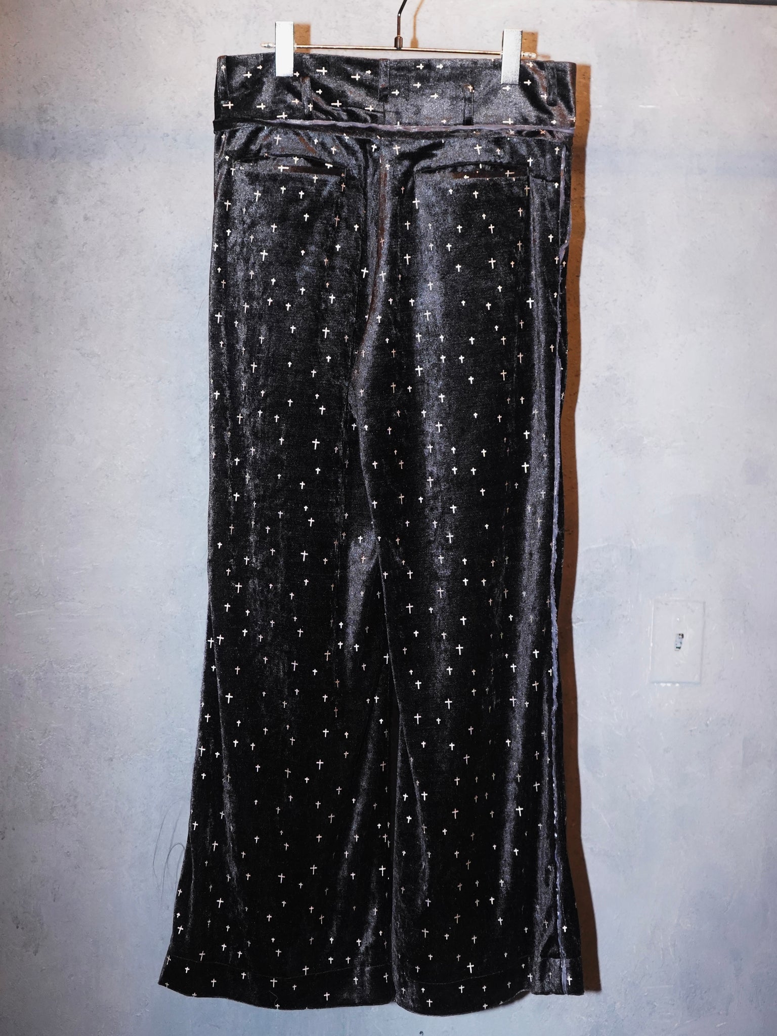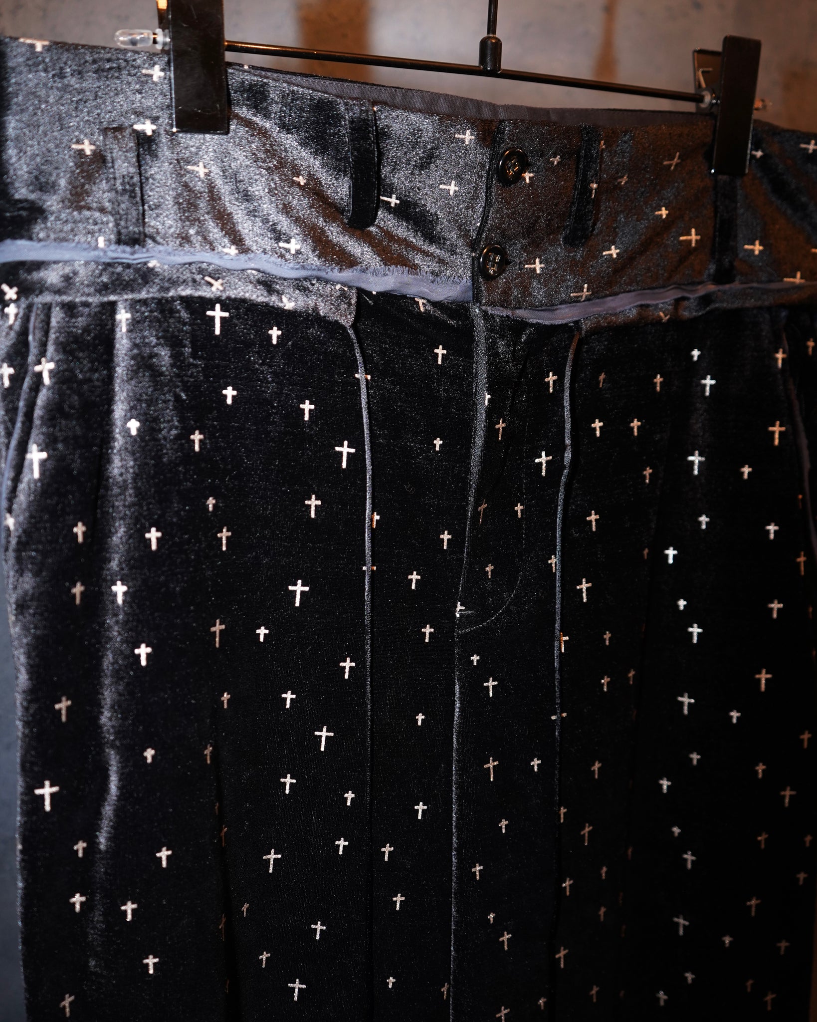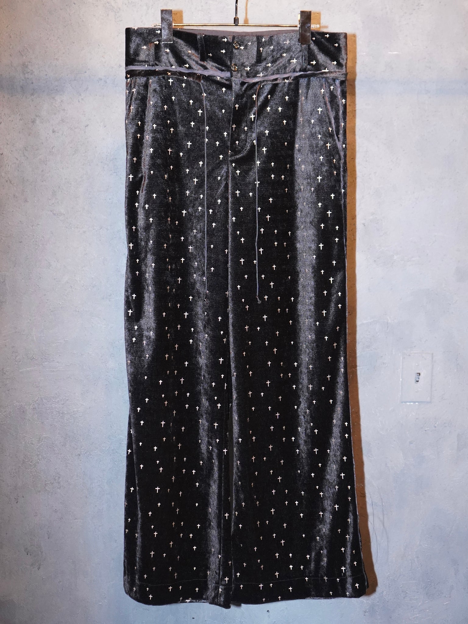 Detail:独自開発された刺繍のような立体的なグリッタープリントを施したベロア生地を使用し、クロスモチーフだがラグジュアリー感の溢れるイージーワイドパンツ。