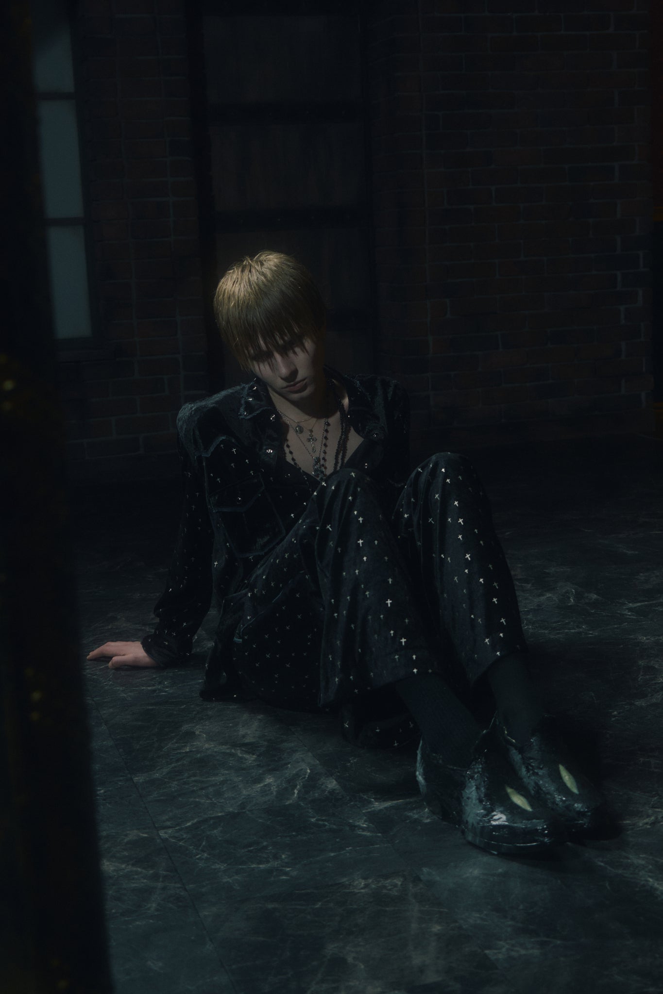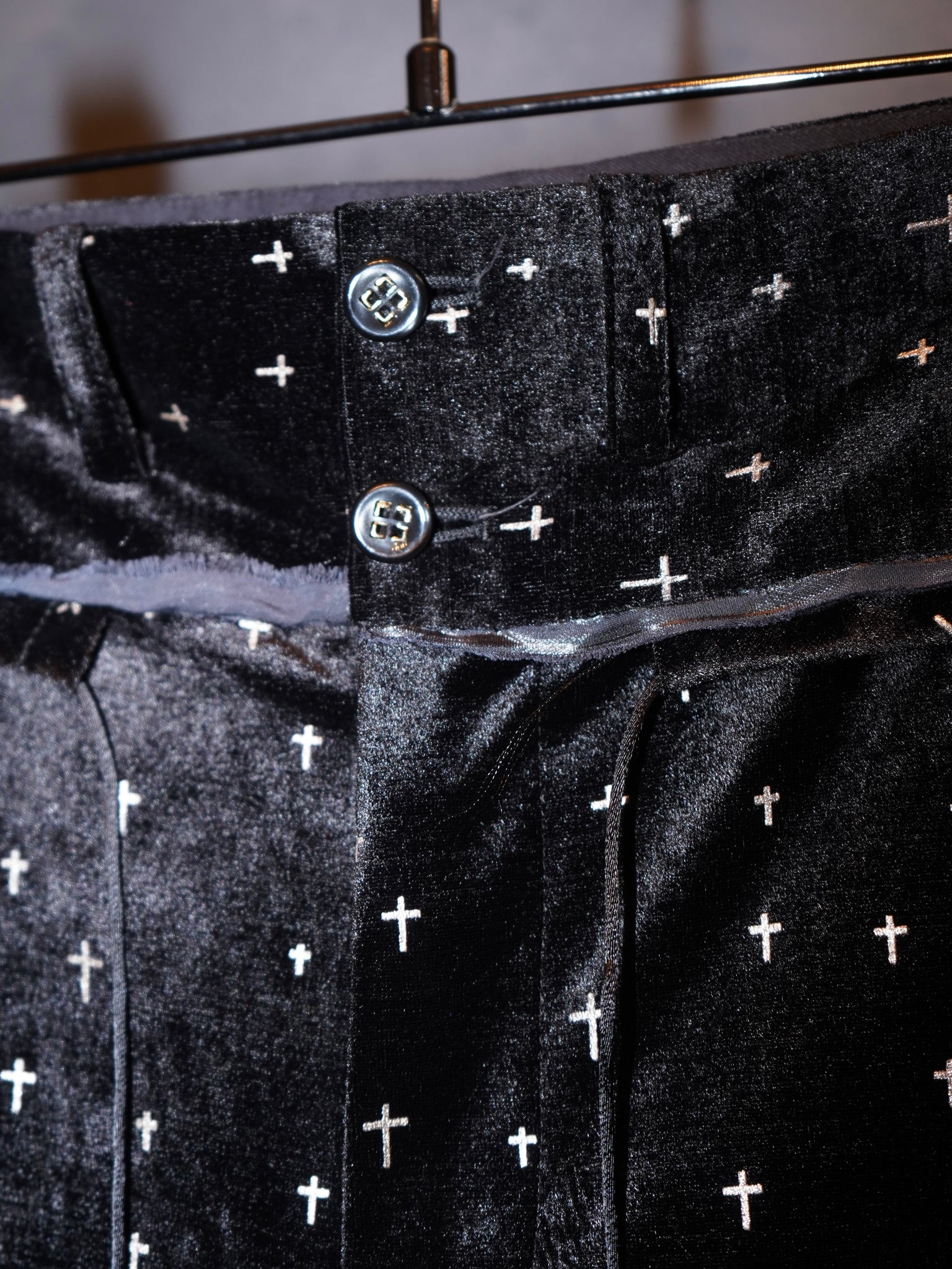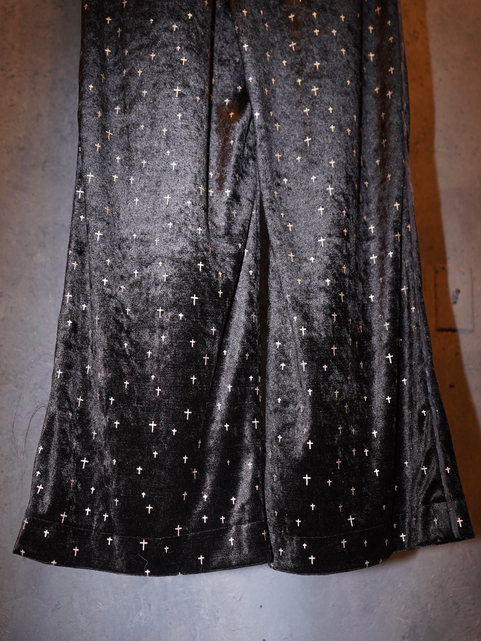 Detail:独自開発された刺繍のような立体的なグリッタープリントを施したベロア生地を使用し、クロスモチーフだがラグジュアリー感の溢れるイージーワイドパンツ。